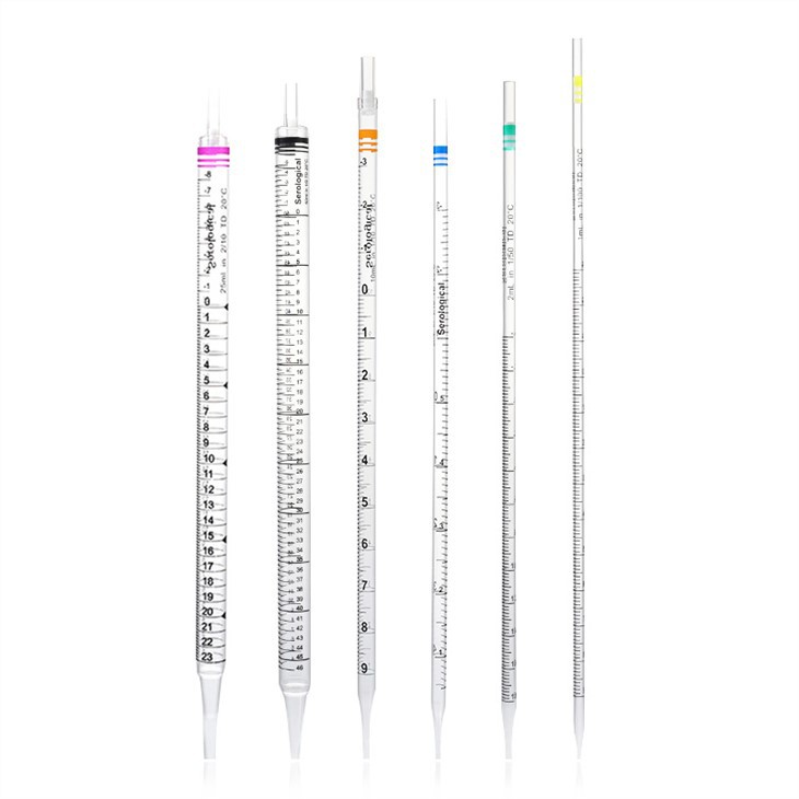 Serološka pipeta je mjerni uređaj koji se koristi za precizno pipetu određenog volumena otopine. Pipeta je mjerni instrument koji se koristi samo za mjerenje volumena otopine koju oslobađa. To je vitka staklena cijev s povećanim dijelom u sredini. Donji kraj je oštrih usta, a linija za označavanje je ugravirana na gornjem kraju vrata, što je oznaka točnog volumena koji treba ukloniti.